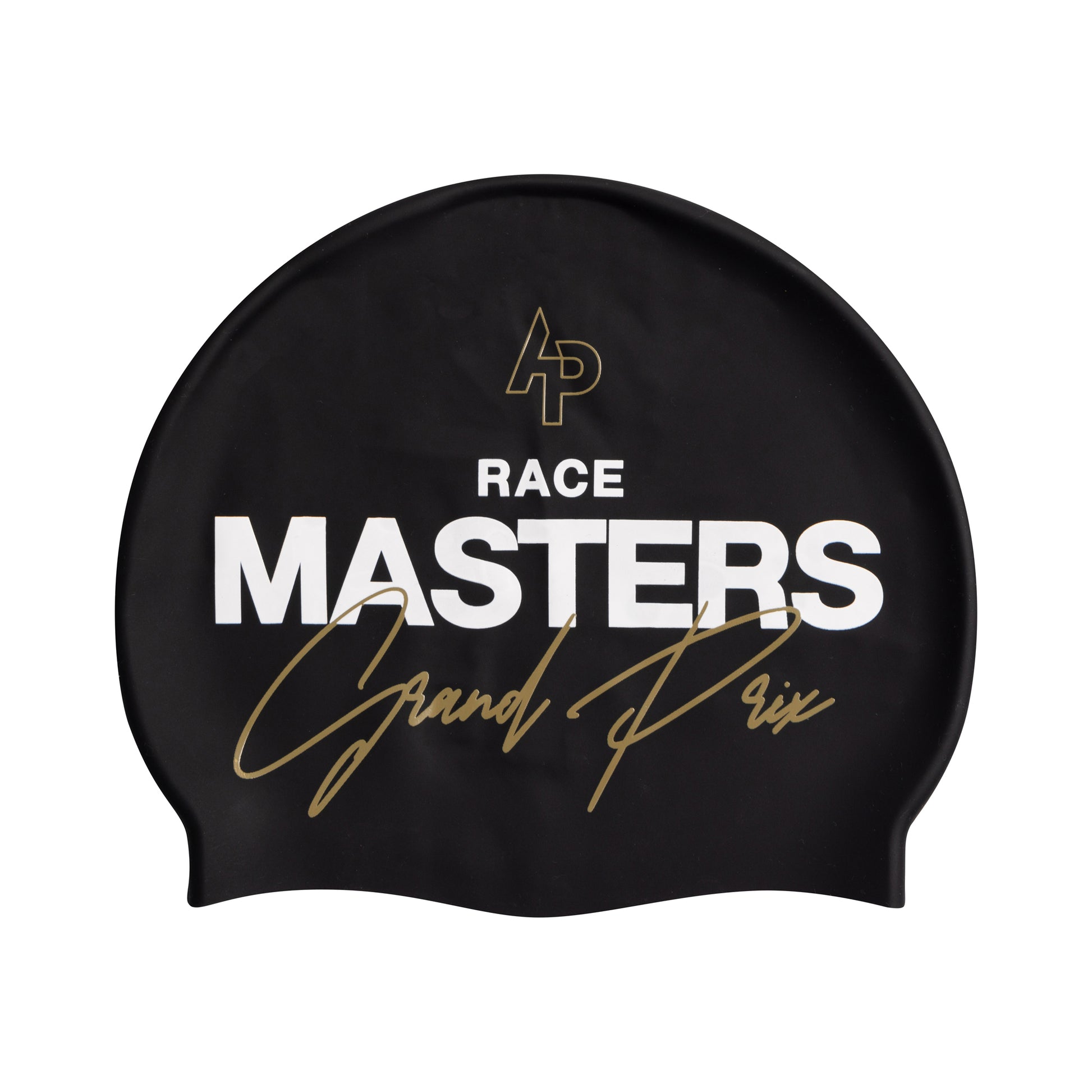 The AP Race Masters Grand Prix Script swimming cap features a premium matte black finish, perfect for training and racing!