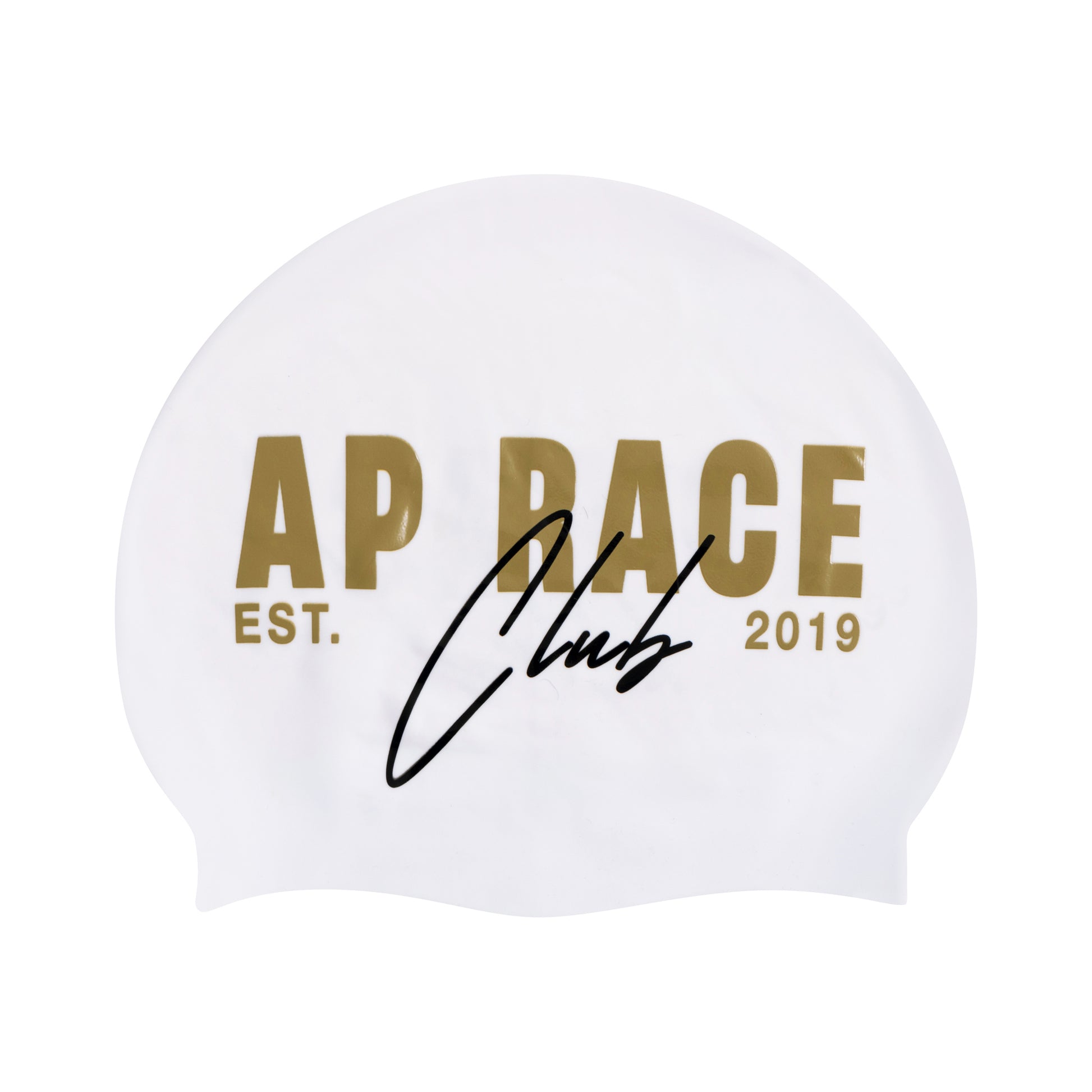 The AP Race Club Script swimming cap features a premium matte white finish, perfect for training and racing! One size fits all.