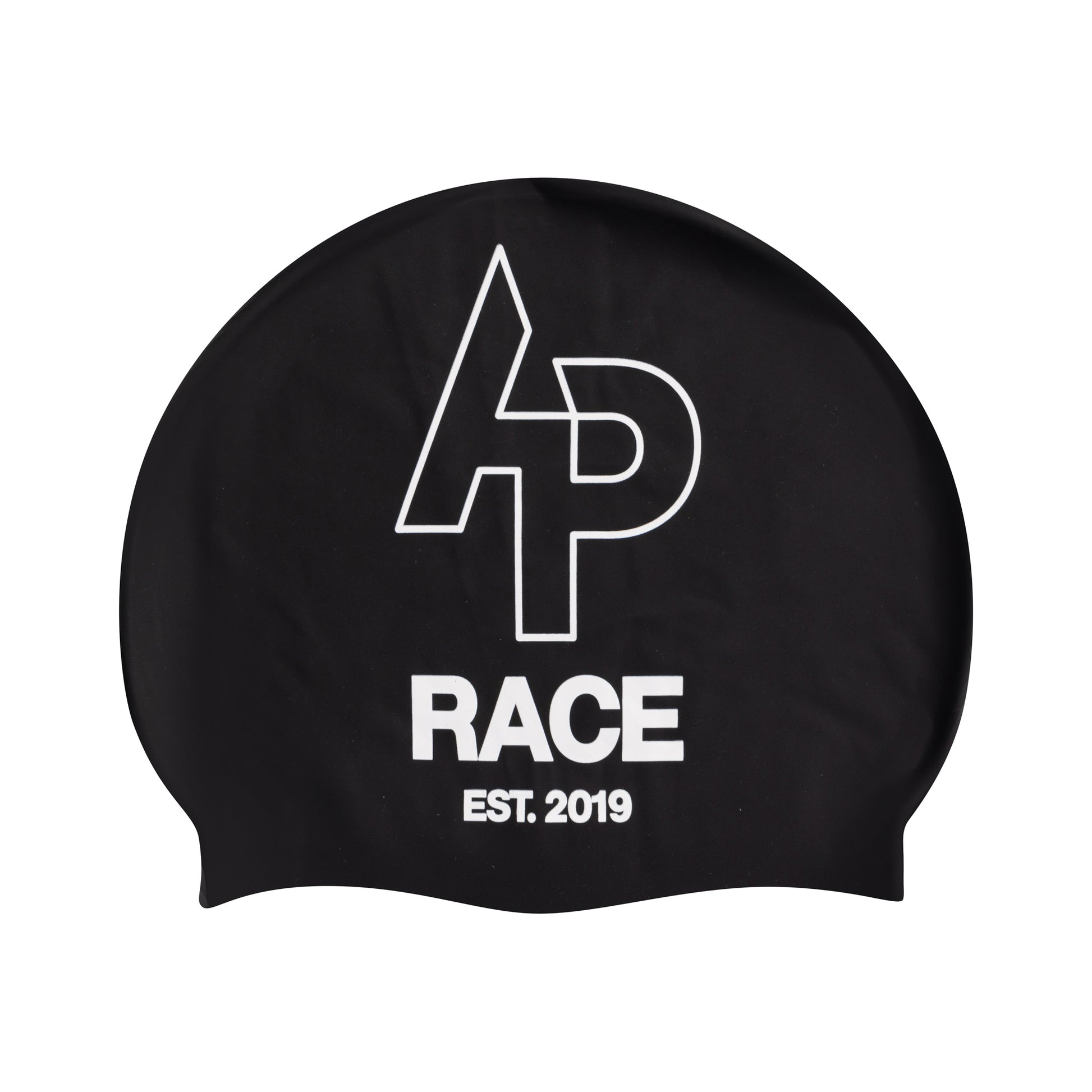 The AP Race Logo swimming cap features a premium matte black finish, perfect for training and racing! One size fits all.